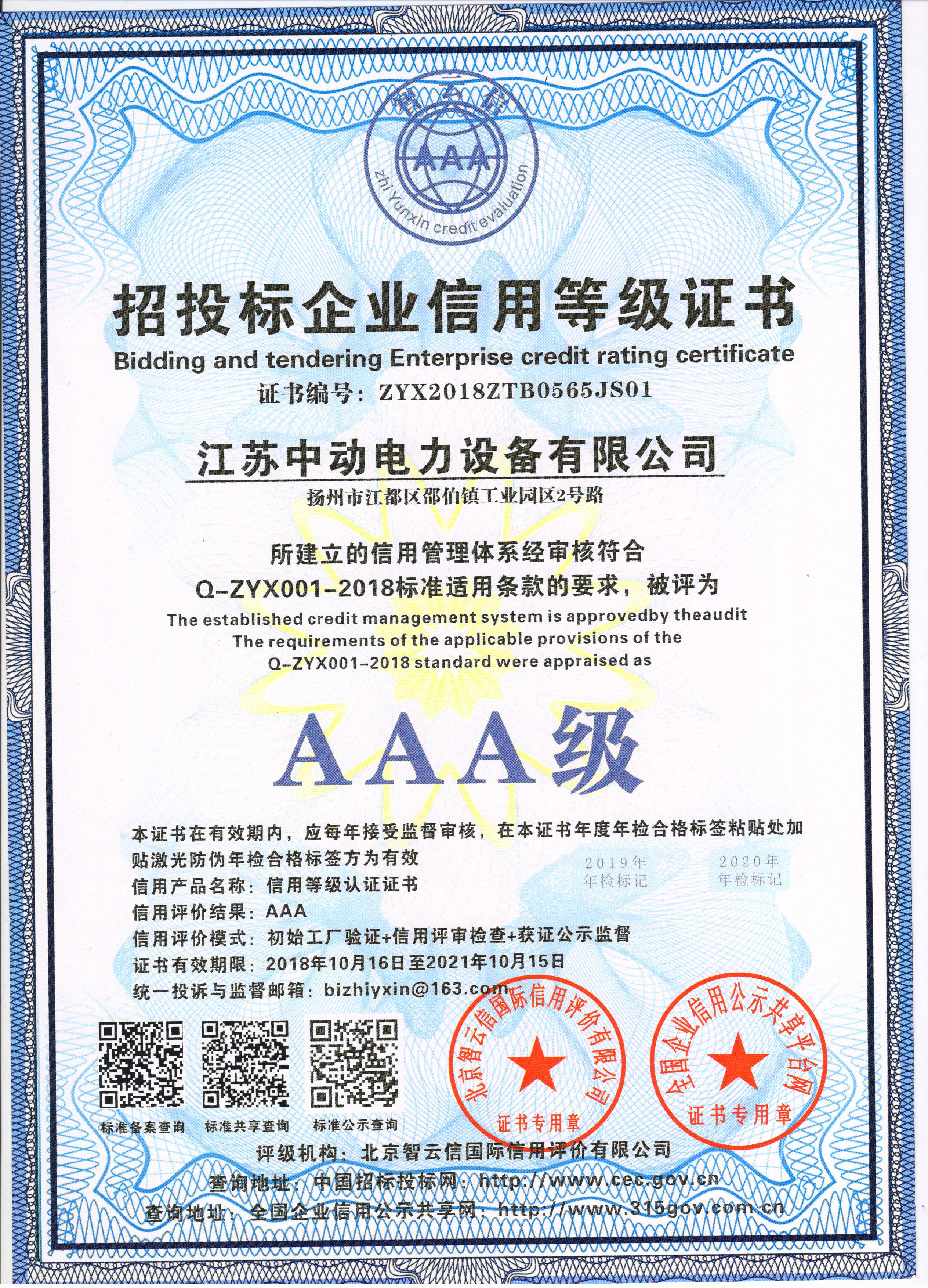 所建立的信用管理體系經(jīng)審核符合Q-ZYX001-2018標(biāo)準(zhǔn)適用條款的要求,被評(píng)為AAA級(jí)別。