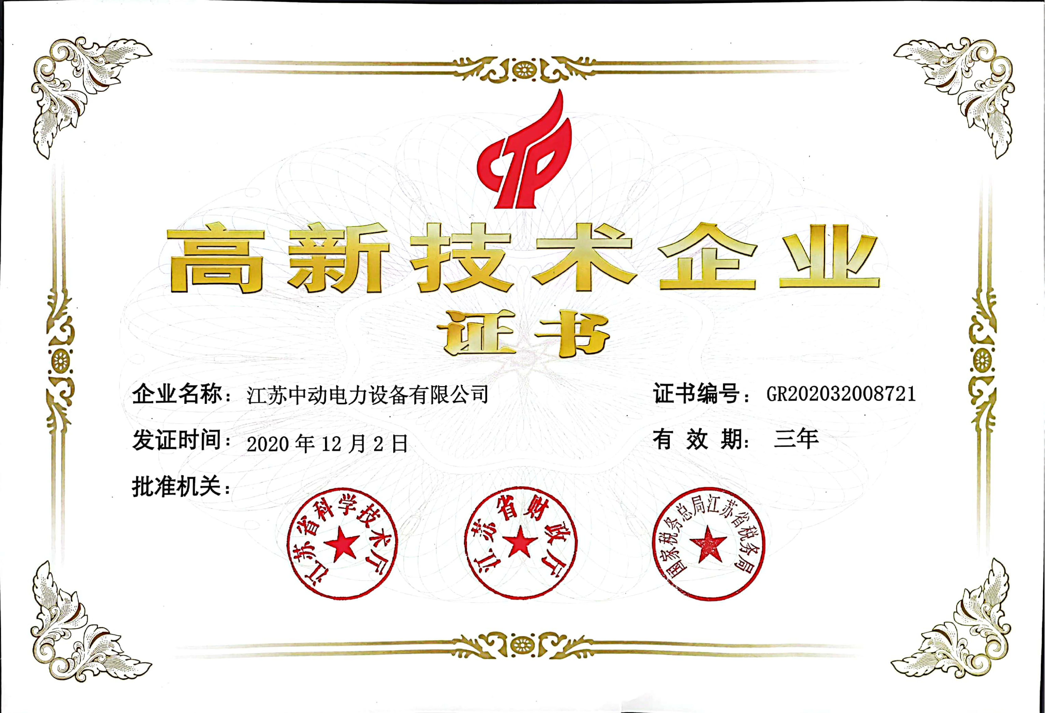 高新技術(shù)企業(yè)高新技術(shù)企業(yè)證書(shū) 江蘇中動(dòng)電力設(shè)備有限公司榮獲高新技術(shù)企業(yè)